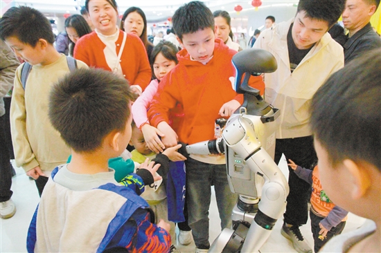 现场,机器狗首次亮相,瞬间成为全场焦点。机器狗听从操作员指令,时而原地踏步,时而快速前进,时而不断跳跃,引得大家啧啧称赞。智能机器人也是全场的一大亮点,它可以抬手和大家打招呼,也可以和大家握手。操作员的灵活操作与机器狗、机器人的灵敏响应赢得了观众的欢呼声,活动现场气氛热烈。