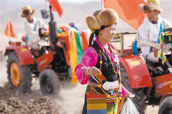 3月16日,拉孜县曲下镇土林村村民身着节日盛装参加春耕典礼。