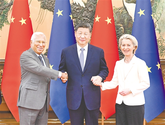三是践行多边主义,维护国际规则秩序。面对战争与和平、竞争与合作、封闭与开放的重大选择,多边主义、团结合作才是正确答案。中欧要共同维护第二次世界大战结束后建立起来的国际规则和国际秩序,与时俱进推动构建更加公正合理的全球治理体系,携手应对气候变化等全球性挑战,让多边主义的火炬照亮人类前行之路。中欧要支持通过政治手段和平解决国际争端。中方一贯从事情本身的是非曲直出发,主张劝和促谈,倡导标本兼治。中方愿同欧方加强协调,推动今年联合国气候变化贝伦大会取得成功,为应对气候变化和全球绿色转型作出更大贡献。中方也愿同欧方开展人工智能领域政策沟通和务实合作,共同推动平等有序的世界多极化、普惠包容的经济全球化。