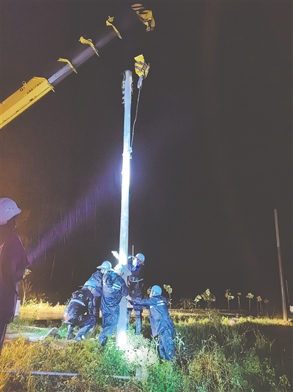 9月24日,南方电网广东江门台山供电局台城供电所抢修人员在夜色中,借着应急灯微弱的光线,组立新电杆、更换断裂的低压导线。