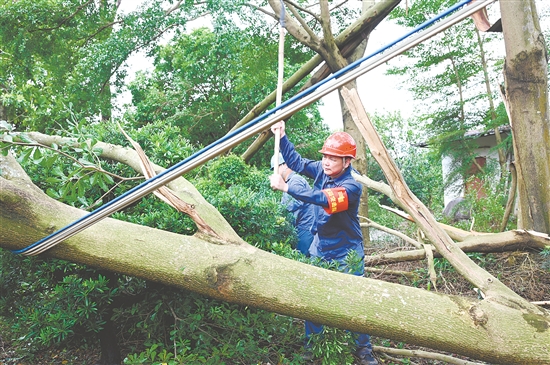 台风过后,南方电网广东江门新会供电局抢修人员马不停蹄开展现场抢修。