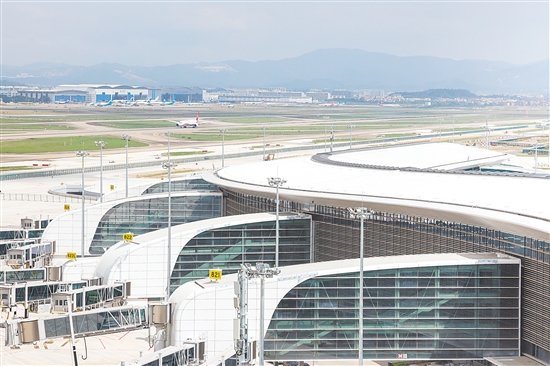 日前,由中建深装等单位承建的广州白云机场三期扩建工程T3航站楼项目装饰工程基本完工,航站楼预计2025年年底投运。建成投运后,白云机场年旅客吞吐能力、货邮吞吐能力将分别达到1.2亿人次、380万吨。图为站在广州白云机场T3航站楼最高处观景台,可以将白云机场三座航站楼尽收眼底(9月29日摄)。 新华社发