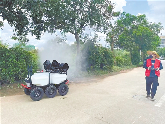 园区围墙边角、道路沿线绿化带等区域,常因管理盲区出现垃圾堆积、杂草丛生的情况,成为隐匿的“蚊虫据点”。传统人工消杀方式,对闲置空地高空区域、绿化带、楼顶等处,往往显得力不从心。为提升园区消杀范围和消杀效率,台山工业新城充分发挥资源优势,第一时间利用无人机和无人车开展精准喷洒与立体消杀,其中3台无人机、2台无人车,早晚进行消杀。