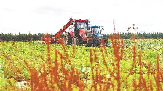 图为10月8日,在北大荒集团黑龙江红星农场第四管理区,农机在收获白菜。