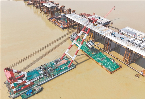 10月10日,由中铁建大桥局承建的万龙大桥吊装架设首节段主塔。位于广州南沙区的万龙大桥跨越珠江口龙穴南水道,全长5146米,主桥长1150米,主跨608米,为粤港澳大湾区又一世界级桥梁。