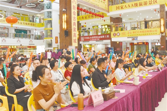 作为新会古典家具城国庆活动的重头戏,由新会区古典家具商会主办的第五届新会古典家具行业歌王大赛于10月1日当天激情开唱。这项已成功举办五届的赛事,以其高规格、高水平在业内积累了极高人气。16组参赛选手在舞台上用歌声表达对祖国的祝福、对行业的热爱,为现场游客献上一场视听盛宴,也成为了假期首日聚集人气的焦点。