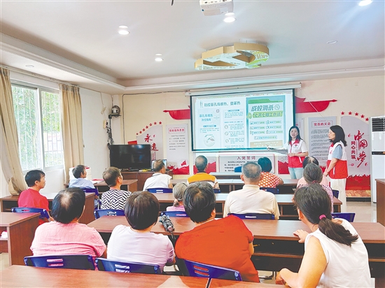 近日,在恩城街道南村委会沙片村,一棵老榕树下坐满了村民,宣讲志愿者用恩平方言亲切地为大家宣讲:“白纹伊蚊偏爱深色衣物,大家要多穿浅色长袖衣服。”“家里瓶瓶罐罐积了雨水,那就是它们孳生后代的‘温床’,要及时清理!”通俗易懂的语言,配上生动的比喻,引得现场笑声阵阵。