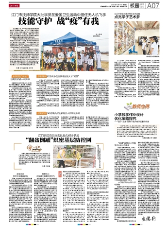 在这场没有硝烟的战争中,江门职院教工党员将防控知识转化为具体行动——在蓬江区潮连街道的老旧小区里,他们手持长柄夹清理绿化带中的饮料瓶;在下水道口,队员们弓着身子安装防蚊纱网,汗水顺着脸颊往下流。