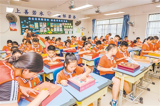 在江南小学,学校的架空层热闹非凡。学生们在老师的引导下,手提各式各样的月饼盒,排队参与回收行动,并获得了一份文具小礼品。此外,该校各班还开展了主题手工课,同学们充分发挥创意,将废旧月饼盒变废为宝,制作成了时钟表盘、冰箱贴等。“比起单纯的课堂讲解,这样的实践活动更具感染力和吸引力。”江南小学教师张颖说。