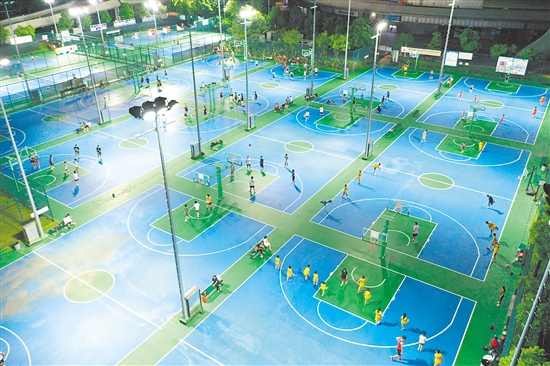 除了大型体育公园,江门还“见缝插针”完善社区健身设施。在江海区外海街道四大社区,老旧休闲公园改造后,新增儿童篮球场;在礼乐街道新民村,高速公路桥下的闲置空间也被充分利用起来,建设成规范的灯光篮球场……