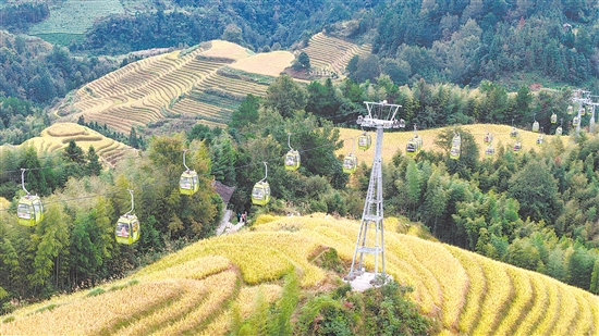 图为10月22日,游客乘坐缆车在广西龙胜各族自治县龙脊梯田观光(无人机照片)。 新华社发