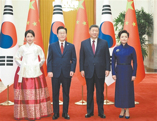 会谈前,习近平和夫人彭丽媛在人民大会堂北大厅为李在明和夫人金惠景举行欢迎仪式。