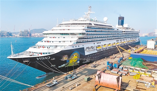 1月7日,“理想”号大型邮轮在中国船舶集团青岛北海造船有限公司厂区内进行维修(无人机照片)。