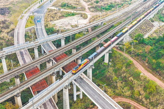 图为当日,铁海联运“重庆造”新能源汽车专列在重庆果园港鱼嘴站顺利发车(无人机照片)。新华社发