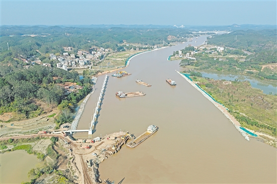 图为广西平陆运河新福航段施工现场(1月11日摄,无人机照片)。