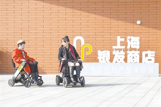 图为1月15日,顾客在上海银发商店门口体验电动轮椅。新华社发