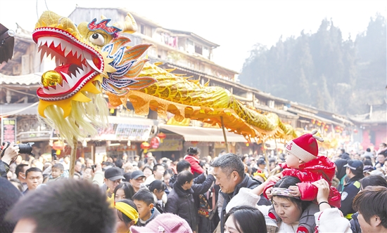 1月17日,四川省雅安市雨城区2026年年猪文化旅游系列活动在上里古镇举行。活动现场推出“喜宴+年猪”剧目演绎,配合民俗文化巡游、非遗展演、吃坝坝宴等活动,让市民游客提前感受浓浓年味。图为当日,在雅安上里古镇,市民游客观看舞龙表演。 新华社发