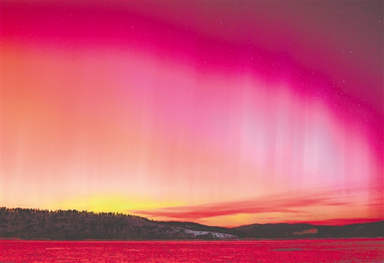 图为当日凌晨在黑龙江省漠河市北极村拍摄的绚丽极光。新华社发