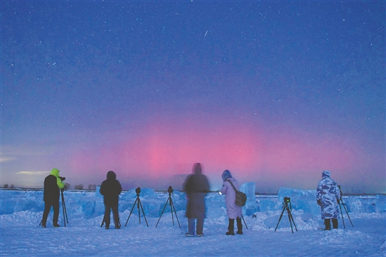 图为当日在黑龙江省齐齐哈尔市,摄影爱好者在拍摄绚丽极光。新华社发