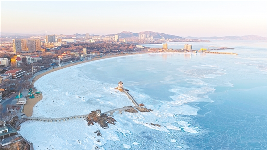 近日,受持续低温影响,辽宁省葫芦岛市附近海域出现海冰,形成独特景观。