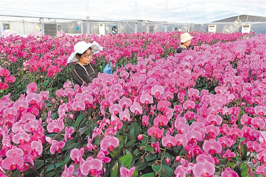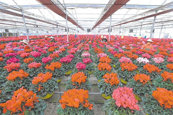 春节临近,山东省青岛市即墨区灵山花卉文化产业园的年宵花迎来生产和销售旺季,花卉大棚内的蝴蝶兰、长寿花、仙客来等竞相绽放,花农们按照订单外运各类花卉,供应节日市场。