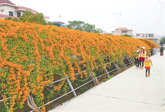 江门日报讯 (文/图 记者/郭永乐 实习生/马萧臻) 近日,鹤山市共和镇大凹村的炮仗花迎来了盛开的季节,1000米长的炮仗花海绵延不绝。这一场气势十足的盛放展现着新年新气象,也寄托着人们对美好生活的祈愿。