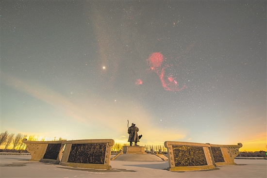 图为1月23日在黑龙江省大庆市杜尔伯特蒙古族自治县阿木塔旅游度假区拍摄的巴纳德环(堆栈合成照片)。巴纳德环是围绕着猎户座的红色半环,是一个发射星云。新华社发