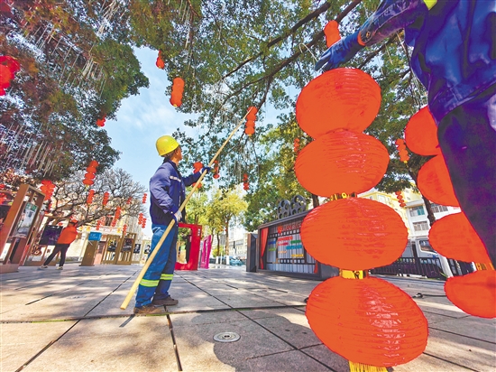 近日,在蓬江区启明里、白沙大道等地,市政工人忙着往路灯杆、绿化树上悬挂大红灯笼、中国结等喜庆装饰品,迎接马年春节的到来。