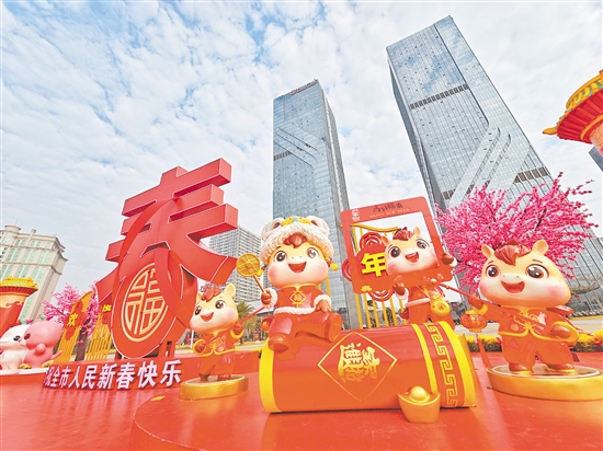 在蓬江万达广场,卡通马年玩偶和十五运会吉祥物喜羊羊、乐融融携手迎接新春佳节,充满了活力;东湖公园前,醒目的马年花卉造型吸引了众多市民打卡;在启明里广场的新年集市打卡日历,也让人感受到农历新年即将到来的热烈气氛。