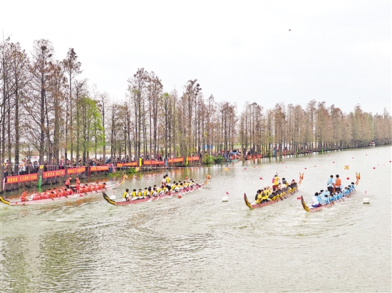 岸边人头攒动,观赛市民比肩接踵,热闹非凡。在现场观看的市民赵婉华笑着说:“农历二月初二赛龙舟是礼乐的习俗。看到队员们心往一处想、劲往一处使,我也跟着一起激动,这就是礼乐独有的热闹和温情。”