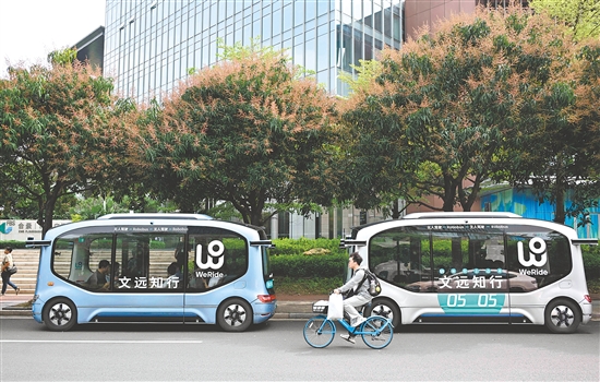 截至目前,广州已累计开放1364条自动驾驶测试道路。全市开展道路测试与示范运营的车辆941辆,涵盖了自动驾驶出行服务、公交小巴、环卫清扫、厢式物流等多种车型。图为3月24日,在广州市海珠区螺旋大道拍摄的文远知行自动驾驶小巴。