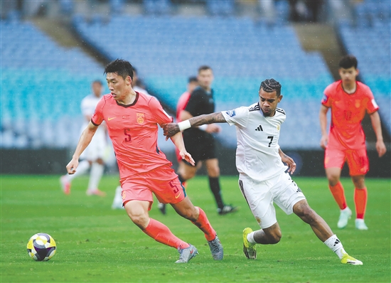 当地时间3月27日,在澳大利亚悉尼举办的2026年国际足联系列赛中,中国队2比0战胜库拉索队。图为中国队球员朱辰杰(左)和库拉索队球员朱尼尼奥·巴库纳在比赛中拼抢。
