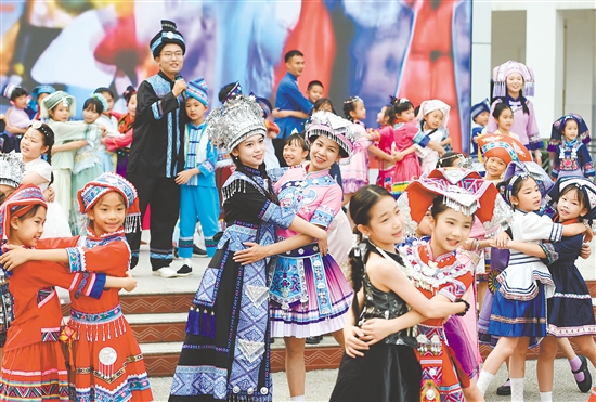 4月13日,广西南宁市滨湖路小学教育集团滨湖校区举行“情系‘三月三’ 同心向未来”主题活动,全校师生欢聚一堂,载歌载舞,喜迎传统节日“三月三”。