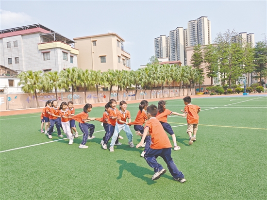 江海区礼乐街道新民小学除了推行跑操、跳绳等常规锻炼外,还推出了多米诺骨牌大赛、课本剧大赛等特色活动,以及结合当地民俗打造“礼乐龙舟”主题课程,让学生通过模拟划旱地龙舟,全面动起来。“我校还依托全学科心育体系、‘遇见最美’主题活动及‘一人一台账’精准辅导机制,将心理健康教育深度融入每一次课间,引导学生在轻松的运动与趣味游戏中释放压力、调节情绪,实现体魄强健与心理健康的和谐统一。”新民小学校长伍顺燕介绍道。