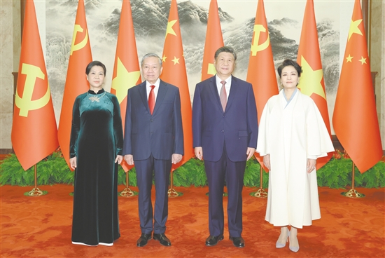 双方要同心协力,携手同行现代化道路。要加快发展战略对接,优先推进基础设施互联互通。要加强人工智能、半导体、物联网等新兴领域合作。中方欢迎更多越南优质产品进入中国市场。双方要继续加强旅游、文化、媒体、教育、卫生、体育等友好交流合作,促进两国人民相知相亲。我愿同你一道宣布启动2026-2027年“中越旅游合作年”。