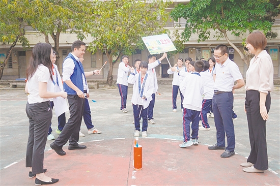 “这道反诈题我会答”“投壶中了,加2分”……活动首站走进月山中学大岗校区,现场没有枯燥的PPT宣讲,取而代之的是投壶竞技、趣味知识问答、假币识别实操等互动游戏。学生们以小组为单位踊跃“闯关”,通过参与游戏积攒积分,欢笑声、喝彩声此起彼伏。