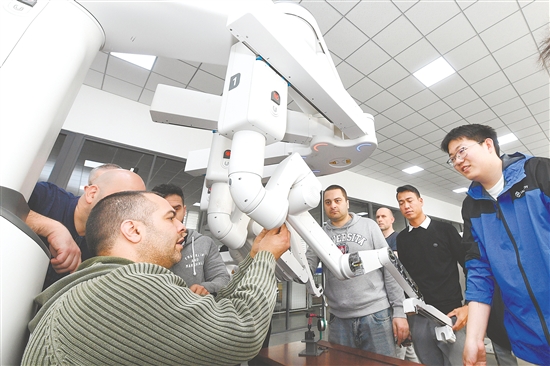 图为4月16日,在哈尔滨思哲睿智能医疗设备股份有限公司技术服务培训中心,技术人员对国外的临床支持工程师进行培训。