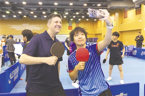在河北正定国家乒乓球训练基地,美中青少年学生交流协会乒乓球代表团团员约翰·奥唐奈和他的中国同伴,用铲子和文件夹代替球拍,上演一场趣味比赛。在相互配合中,陌生感逐渐消散,友谊悄然升温。“通过共同的兴趣和热爱建立友谊,这是一件非常令人振奋且美好的事情。”他说。