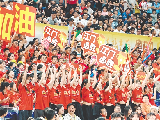 当晚,江门体育中心体育馆座无虚席,近8000名球迷到现场观看比赛。开赛前,精彩的暖场表演带动了整场气氛,双方球迷热情互动,挥舞着各自家乡球队的旗帜加油助兴。