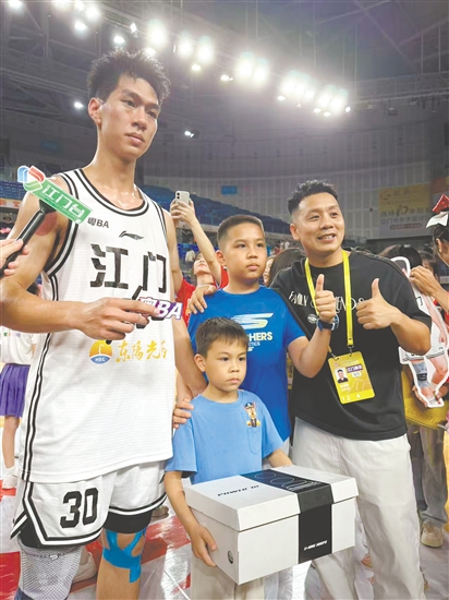 比赛结束后,江门队球员与球迷亲切互动。尤为暖心的是,江门队球员黎俊伟特意为小球迷关晞峻送上了一双篮球鞋,以此激励他坚持篮球梦想。今年还在上幼儿园的关晞峻热爱打篮球,自粤BA开赛以来便一直关注江门队,黎俊伟更是他心中最喜爱的江门队球员。上周,关晞峻的篮球教练林鸿图得知此事后,发布了一条朋友圈,没想到被黎俊伟看到,黎俊伟便主动联系林鸿图,提出要为小球迷送上球鞋以示鼓励。