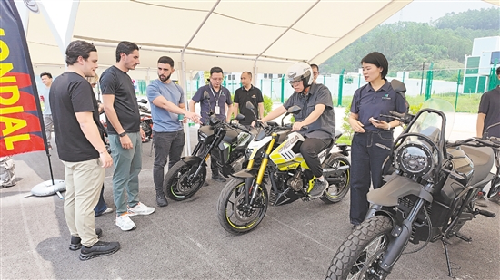 活动现场,外商们纷纷跨上车身、拧动油门,在不同场景下,全面体验车辆的加速、过弯与承载性能。引擎的轰鸣声里,有的外商在爬坡路段感受大排量车型的澎湃动力,有的在平整跑道上体验街车的操控快感,还有不少人围着电摩专区,仔细了解太阳能充电站、换电车型的整套运营方案。记者在现场看到,200余亩的专业试车场已从去年的1条主跑道,扩展为如今8条不同测试路段,爬坡、越野等场景一应俱全,为客商试驾与产品测试提供了完善的条件。