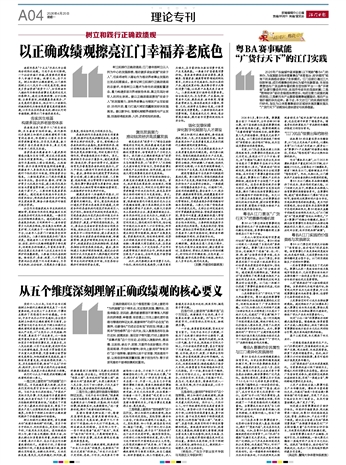 正确政绩观可从五个维度把握:立场上要把牢“为民造福”这个根本点,无论是抓发展、惠民生,还是保稳定、防风险,最终都要落到不断增强人民群众的获得感、幸福感、安全感上;方法上要处理好显绩与潜绩的辩证关系,既要保持“功成不必在我”的境界,也要强化“功成必定有我”的担当;根基上要筑牢“党性修养”这个总开关,深入查摆是否存在急功近利、脱离实际、搞花架子等问题;行动上要坚持“实事求是”这个方法论,必须深入调查研究,察实情、出实招,使点子、政策、方案符合实际情况、符合客观规律、符合科学精神;导向上要用好“考核评价”这个指挥棒,要坚持以实干论英雄、凭实绩用干部,让那些坚持高质量发展、勇于担当作为、善于攻坚克难的干部得到褒奖和重用。