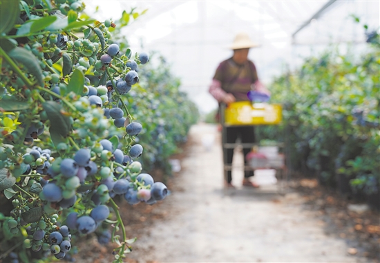 图为4月20日,村民在云南省澄江市一处蓝莓种植基地采摘蓝莓。