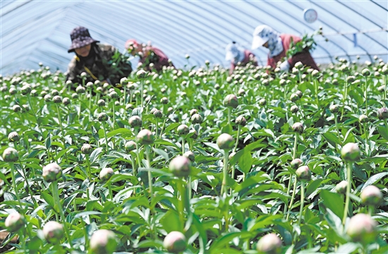 图为4月20日,花农在河北省邯郸市峰峰矿区义井镇芍药鲜切花种植基地内采摘芍药鲜切花。新华社发