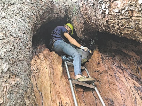 “保护古树不能‘一刀切’,得顺着树的性子来。”刘峻均说。专业人员勘察树体、检测土壤、排查病虫害,针对“空心”这一特点,量身定制了科学的修复方案——先清理树洞深处的腐烂木质,做好防腐防虫;再用环保材料填充加固,既挡住雨水侵蚀,又留住了“空心”的独特模样。